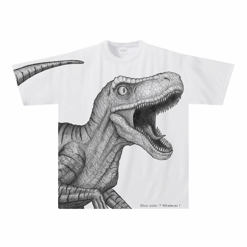 恐竜全面印刷白Tシャツ Lサイズ ヴェロキラプトル Dinosaur Velociraptor Big print Jurassic T-shirt